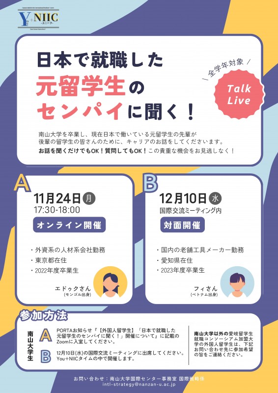南山大学を卒業し、現在日本で働いている元留学生の先輩をお招きし、後輩の留学生の皆さんを対象としたキャリアに関するトークライブを全2回実施します。お話を聞くだけでもOK!質問してもOK!
